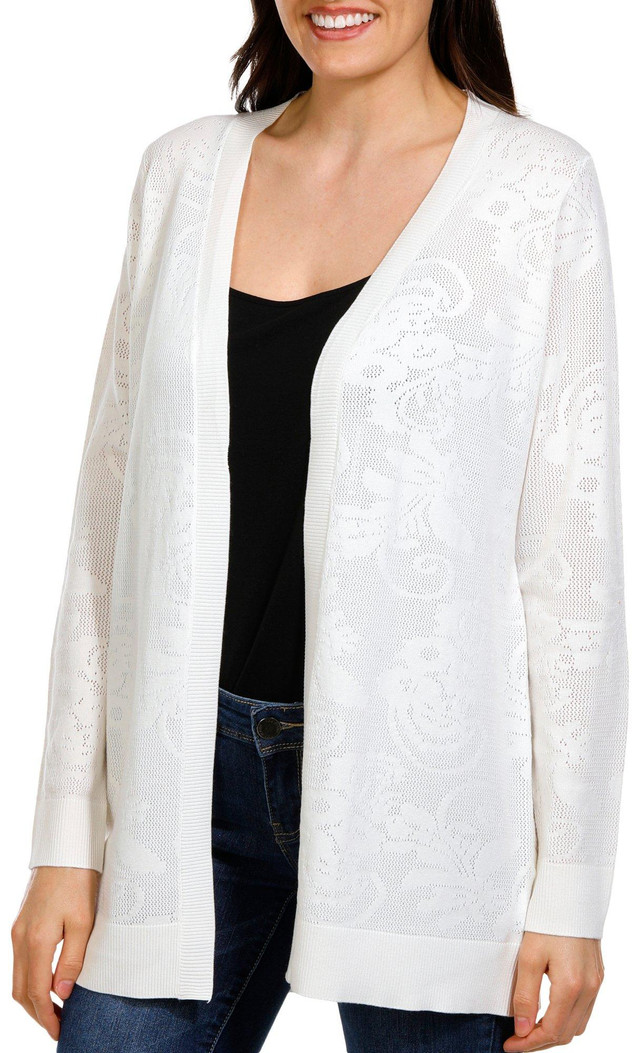Introducing the Long Sleeve Open Cardigan, a perfect blend of elegance and comfort. This cardigan features a beautiful novelty stitch embroidered design that adds a unique and artistic touch. The open front design allows for easy layering, making it a versatile addition to your wardrobe. Fabrication is 70% viscose, 30% polyester.