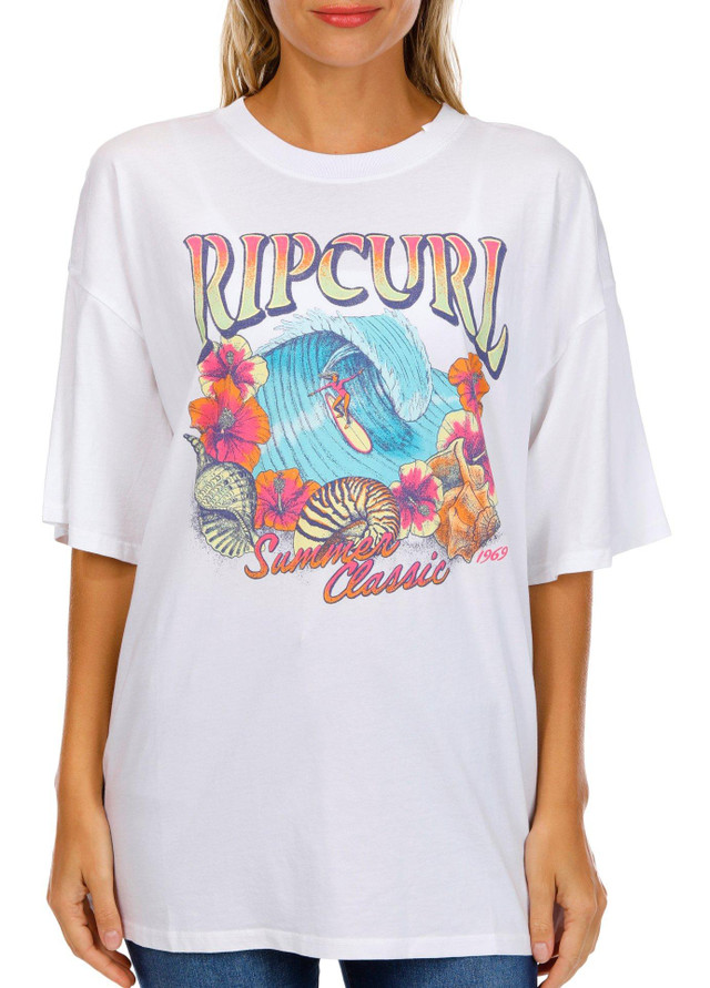 Channel surf inspired style with the Juniors Crew Neck Hawaii Classic Tee T-shirt featuring a front graphic of wave art, floral accents and Summer Classic text. Designed with a crew neckline and short sleeves for a timeless casual fit. Fabrication is 100% cotton. Length measures approximately 28.5 in.