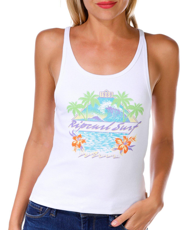 This juniors ribbed tank top features an island inspired graphic print that brings a laid back vibe. The scoop neckline and racerback design offer a flattering fit while the soft ribbed fabric adds comfort and stretch. Fabrication 95% cotton, 5% spandex