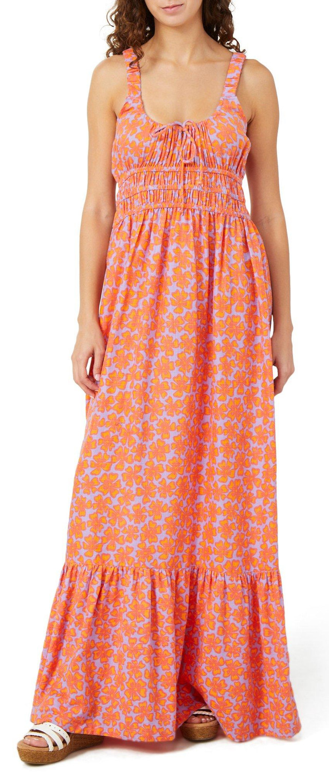 Channel tropical charm in the Juniors Neon Isles Maxi Dress. Featuring a vibrant floral print, scoop neckline with a playful front tie, and a breezy maxi length, this dress is perfect for sunny getaways and summer strolls. Fabrication 52% cotton, 48% viscose