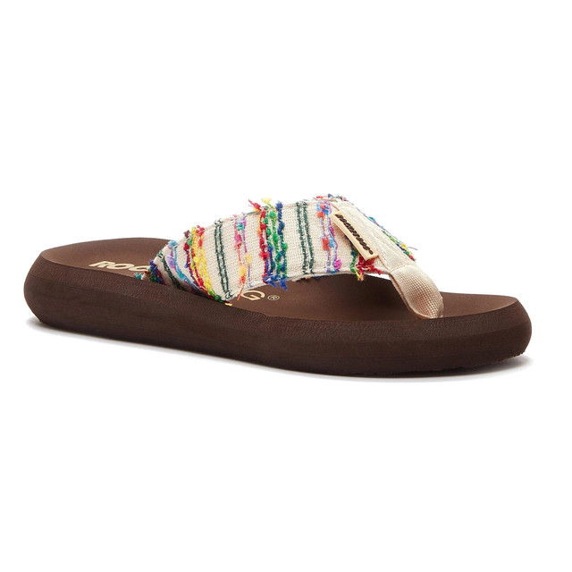 From the beach to the pool, these Spotlight 2 Merry Maker Women's Flip Flop Sandals are the perfect choice. Features include easy everyday wearability, patterned cotton straps, convas cotton lining, EVA outsole & footbed and a 1 inch platform height.