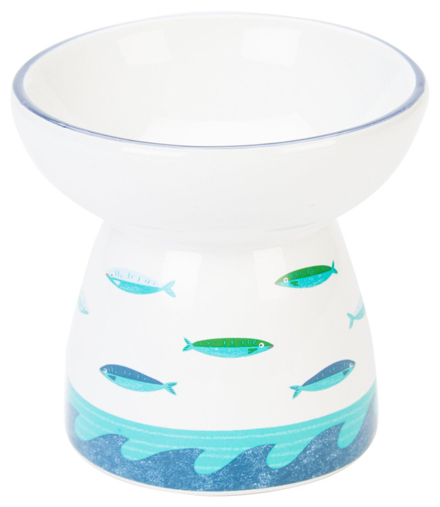 Enhance feeding time with the 5 in Sardines Waves Elevated Ceramic Pet Bowl featuring a raised base decorated with an all over fish pattern and wave accents at the bottom. Combines functional design with coastal charm. Fabrication is 100% ceramic. Measures approximately 5 in x 5 in round.