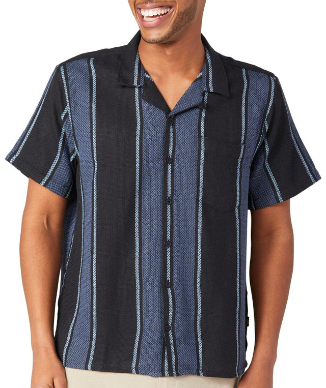 This short-sleeve camp collar shirt features vertical stripes in various tones, crafted from a textured, breathable fabric. With a laid-back, warm-weather vibe, its perfect for casual days and effortless style.