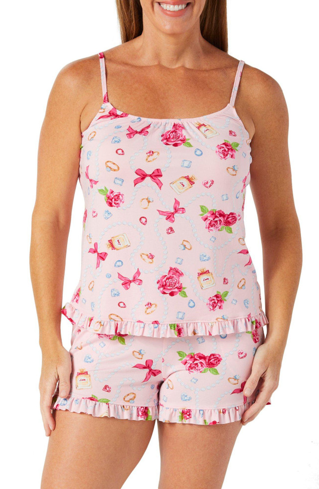 Slip into comfort with this womens 2 piece sleepwear set featuring a cami and shorts adorned with a playful bow print. Made from soft breathable fabric it is perfect for lounging or a cozy nights sleep. Fabrication 94% polyester, 6% spandex