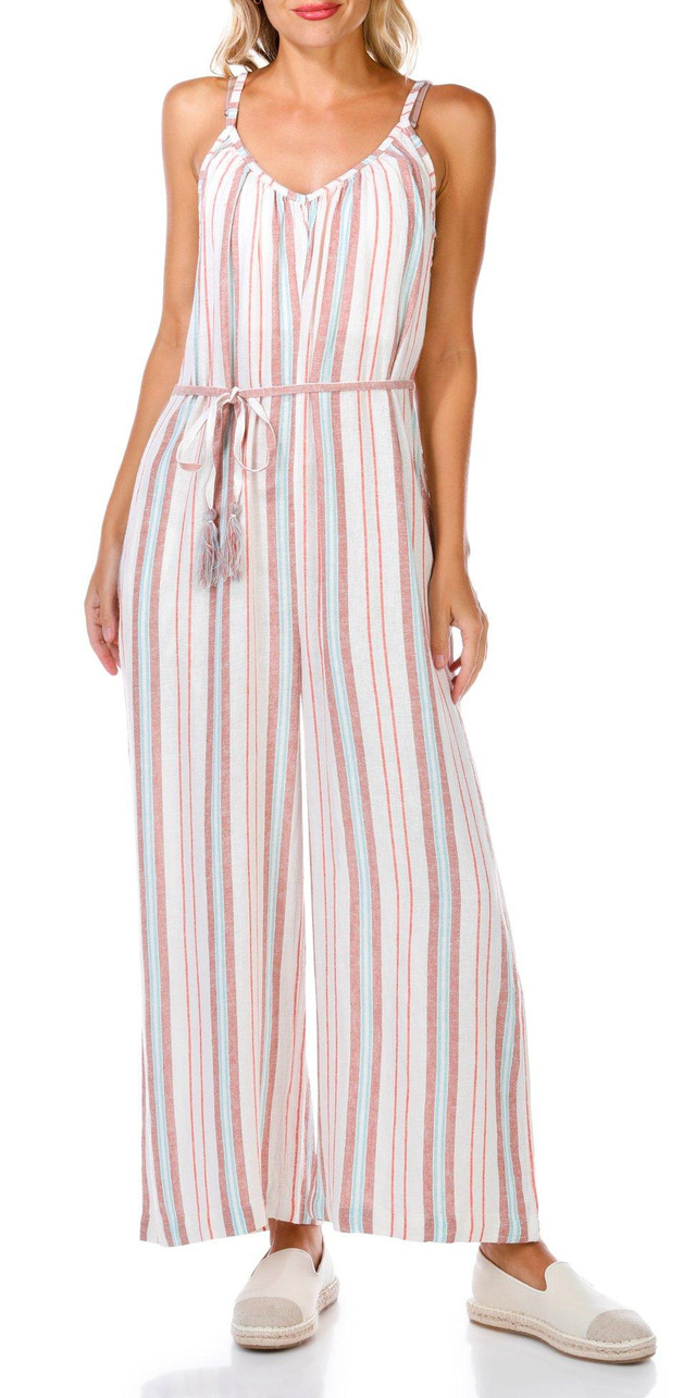 Make a statement in the Juniors Gale Jumpsuit, featuring a bold striped print, flattering v-neckline, and adjustable straps. With side seam pockets, a waist tie, and a wide leg fit with a 25 inch inseam, it is the perfect blend of comfort and standout style. Fabrication is 55% linen, 45% viscose