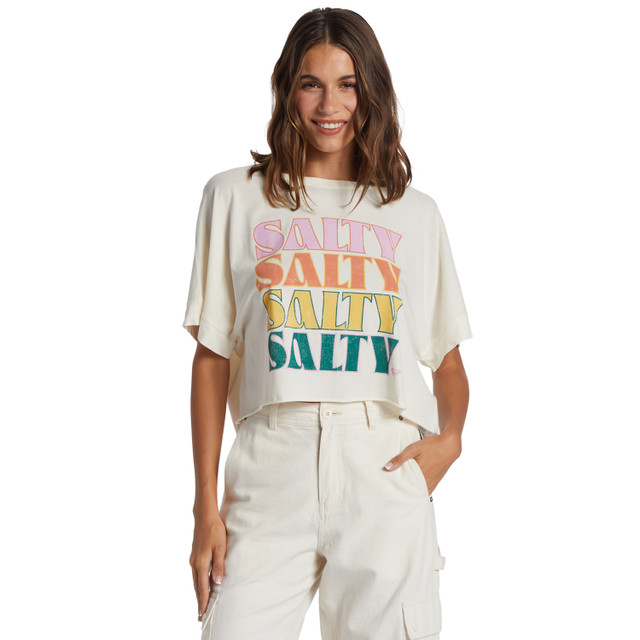 This Juniors Salty Stack Graphic Tee is a oversized crop and is effortlessly cool. Crafted from a soft cotton slub jersey, this boyfriend tee features a casual crew neck and a playful graphic print that captures the carefree spirit of the surf.