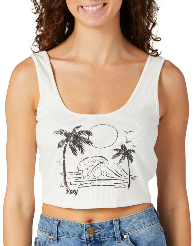 Introducing the Juniors Simple Surf Tank Top, crafted from a blend of cotton and polyester for a comfortable and breathable feel. This stylish tank top features a beach graphic design on a ribbed fabrication, adding a touch of coastal charm to your casual wardrobe. The scoop neckline and cropped length offer a trendy and versatile look, perfect for warm weather outings.