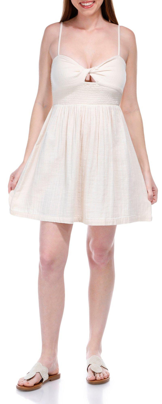 Introducing the Juniors Sunrise Vibes Dress, crafted from 100% cotton for a soft and breathable feel. This dress features a stylish solid color, adjustable spaghetti straps, and a smocked design on the chest for a flattering fit. With a 26-inch length, it's perfect for any casual or semi-formal occasion, offering both comfort and style.
