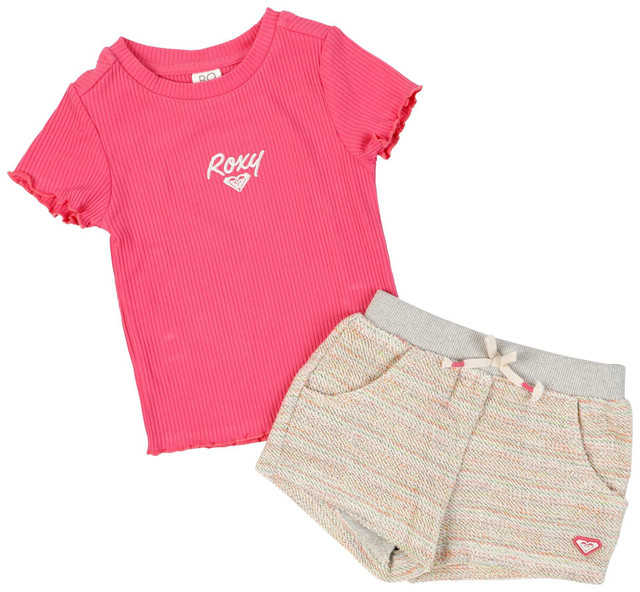 The Little Girls 2 Pc Shorts Set blends sweet style with everyday comfort. Made from a cotton-polyester blend, it features a ribbed short sleeve top with lettuce trim and embroidered logo script on the chest, paired with easy pull-on tweed shorts for a cute and comfy look.