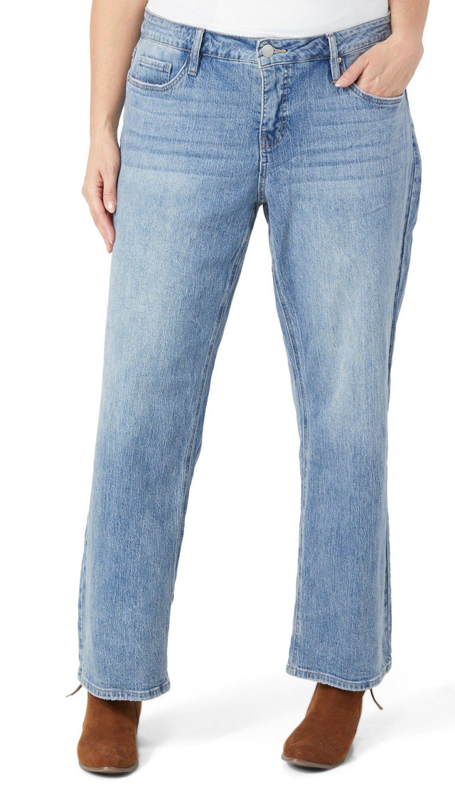 These plus size jeans feature a high rise and wide leg design with a classic 5 pocket style. Finished with button and fly closure, they offer a comfortable and flattering option for casual or dressy wear. Inseam is approximately 31.5 in. Fabrication is 99% cotton and 1% spandex.