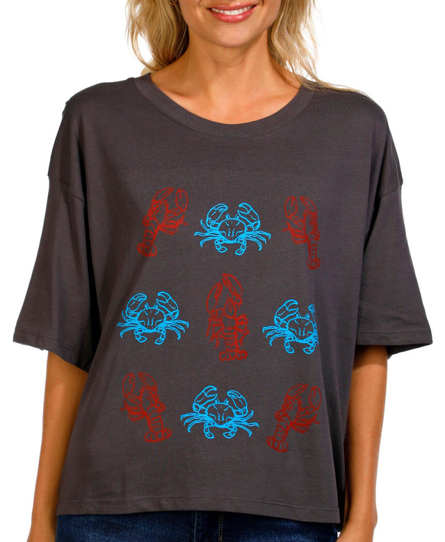 Embrace sunny vibes with this Juniors Lobster and Crab Graphic Crop T-Shirt. Made from premium cotton, this tee features a lobsters and crabs graphic design, short sleeves, a classic crew neckline and a stylish cropped length. Perfect for casual outings or beach days, this t-shirt combines comfort and style effortlessly, making it a versatile addition to your summer wardrobe. Fabrication is 100% cotton. Top length measures approximately 22 in.