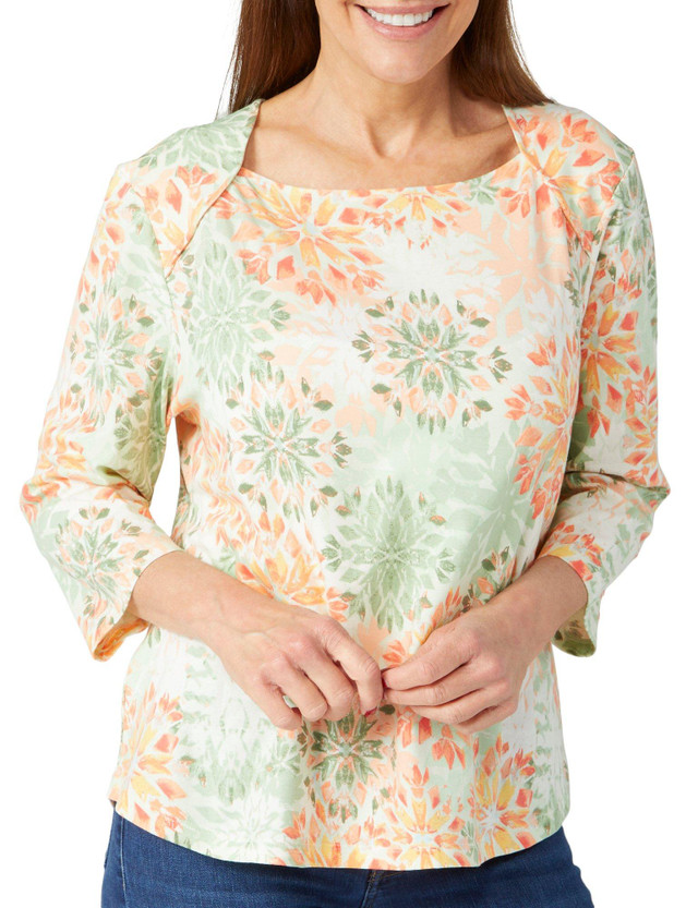 This elbow sleeve top features a stylish print on a lightweight and soft fabric material. It also has a subtle shoulder pleat to make this top extra special. Measures approximately 23 in. Fabrication is 95% cotton, 5% spandex.