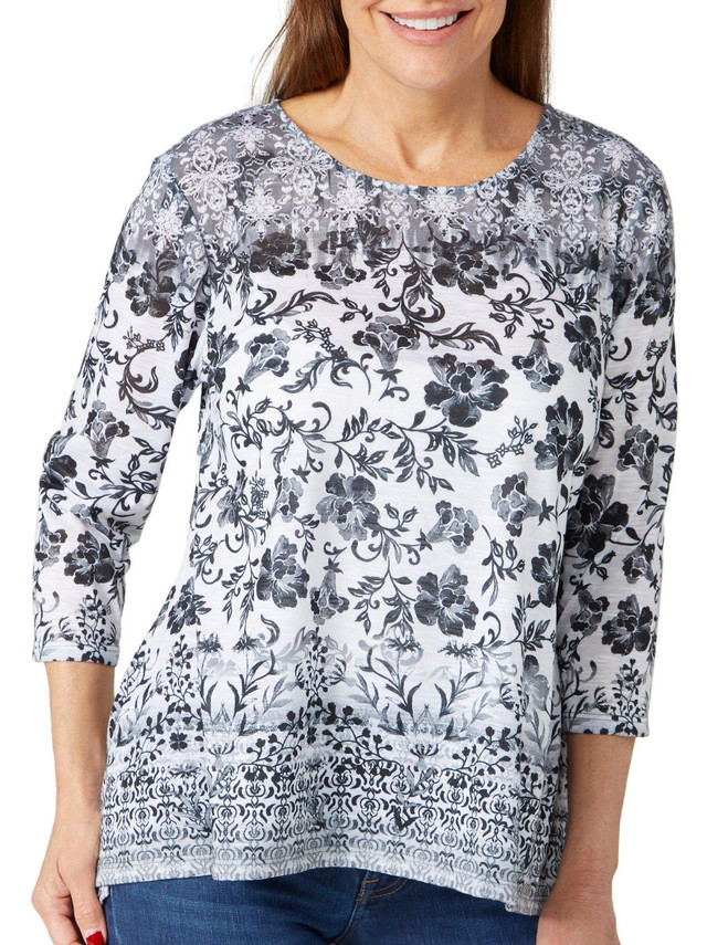 This elbow sleeve top features a stylish print, lightweight and soft fabric material, and a boat neckline. Measures approximately 21 in. Fabrication is 100% polyester.