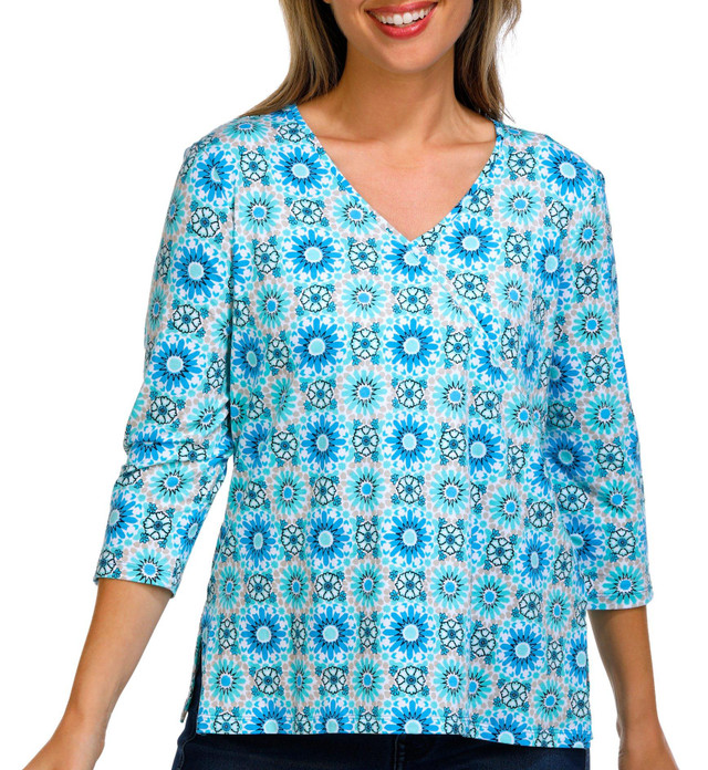 Shine bright with this Petite 3/4 Sleeve Printed Knit Top featuring a comfortable, stretchy fabric with a geometric floral pattern, a v-neck collar and a stylish side split hemline. The eye-catching design adds a touch of style to your everyday look, making it perfect for casual outings and special occasions. Crafted from high quality fabric, this top ensures comfort and style throughout the day. Fabrication made from 95% Cotton, 5% Spandex. Top Length is 25 in.