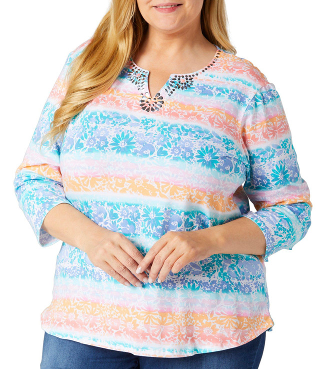 Elevate your style with this 3/4 Sleeve Top. Featuring a vibrant print pattern, this top adds a splash of color to any outfit. The embellished neckline details bring a touch of glamour, making it perfect for both casual and dressy occasions. With its comfortable fit and eye-catching design, this top is a versatile addition to your wardrobe. Fabrication is 95% cotton, 5% spandex.