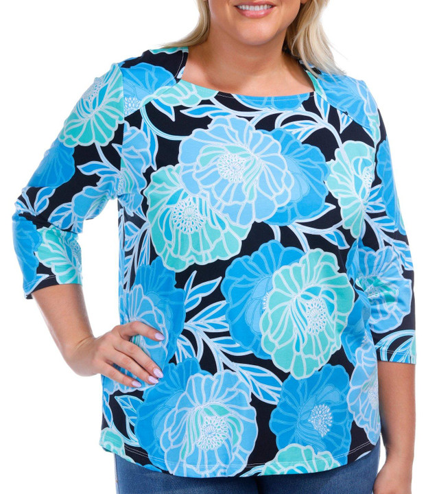 Elevate your style with this 3/4 Sleeve Square Neck Print Top. Featuring an intricate print pattern, this top adds a splash of style to any outfit. With its fitted design and modern print pattern, this top is a versatile addition to your wardrobe. Fabrication is 95% Cotton, 5% Spandex. Top length is 28 in.