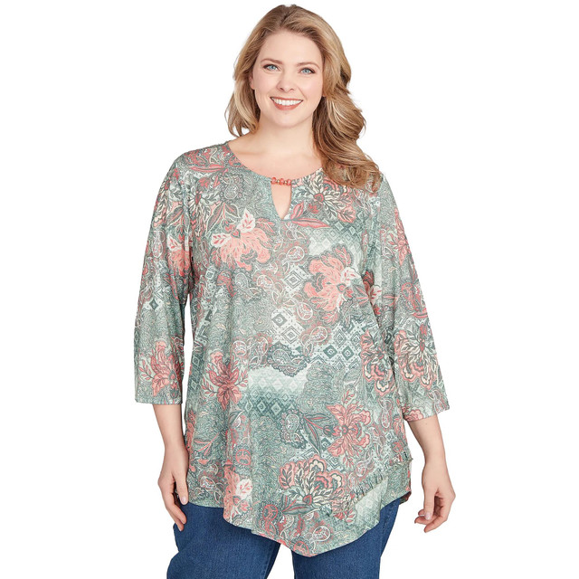 Ruby Road Plus 3Q Sleeve Floral Patchwork Asymmetric Top