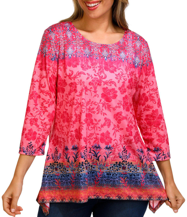 Shine bright with this Womens 3/4 Sleeve Printed Top featuring a comfortable fabric with a colorful floral pattern, a round neck collar and a stylish high-low hemline. The eye-catching design adds a touch of style to your everyday look, making it perfect for casual outings and special occasions. Crafted from high quality fabric, this top ensures comfort and style throughout the day. Fabrication made from 100% Polyester. Top Length is 28 in.