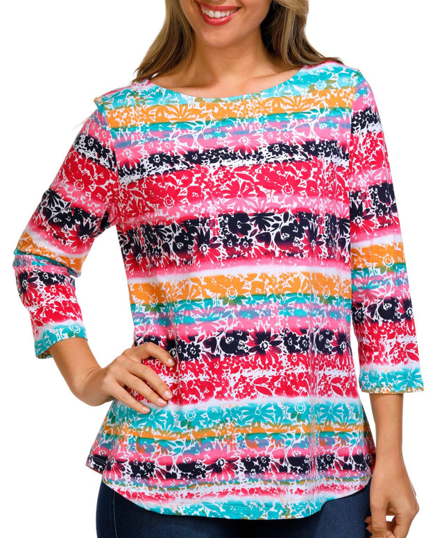 Shine bright with this Womens 3/4 Sleeve Printed Top featuring a comfortable, stretchy fabric with a colorful, floral pattern and a round neck collar. The eye-catching design adds a touch of style to your everyday look, making it perfect for casual outings and special occasions. Crafted from high quality fabric, this top ensures comfort and style throughout the day. Fabrication made from 95% Cotton, 5% Spandex. Top Length is 28 in.