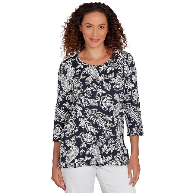 Elevate your weekend wardrobe with this stylish top, featuring a charming design and a flattering neckline. The paisley detail adds a touch of fun, while the 3-quarter length sleeves and relaxed styling ensure comfort. Crafted from lightweight fabric, this top offers a flattering silhouette perfect for all outings. Embrace the season with this versatile piece that effortlessly combines fashion and comfort.