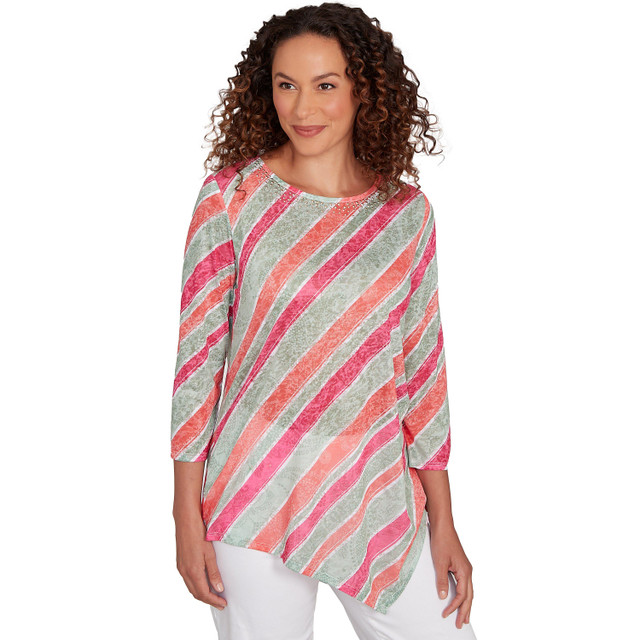 Elevate your weekend wardrobe with this stylish top, featuring a charming design and a flattering neckline. The stripe detail adds a touch of fun, while the 3-quarter length sleeves and relaxed styling ensure comfort. Crafted from lightweight fabric, this top offers a flattering silhouette perfect for Spring outings. Embrace the season with this versatile piece that effortlessly combines fashion and comfort.