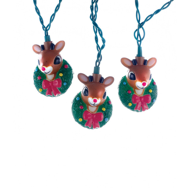 This 10-Light UL Rudolph Head with Wreath Light Set from Kurt Adler is a fun, festive way to add to your holiday décor or display. Each of the 10 lights in this set feature Rudolph with a decorated wreath and red bow. Consists of a 30 in. green lead wire, 12 in. spacing, uses 12V 0.08A clear incandescent bulb, 4 spare bulbs and 1 fuse. A whimsical addition to any home both indoor and outdoor. Measures 138 in. x 1.25 in. x 2 in.