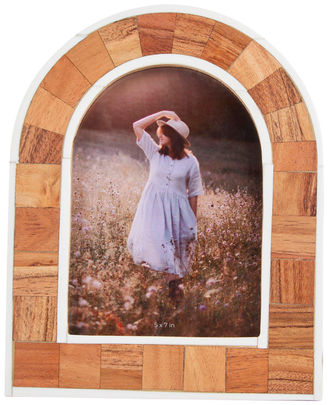 Showcase your favorite photos with this Wood Inlay Arch Picture Frame, beautifully made of wood and resin. The unique arch with wood inlay design adds a touch of modern elegance to any room, while the durable resin construction ensures lasting beauty. Perfect for both contemporary and traditional decor styles, this frame combines functionality with artistic flair, making it a standout piece in your home. Measures approximately: Frame - 9.5 in x 7.5 in x 1 in, Opening - 5 in x 7 in.