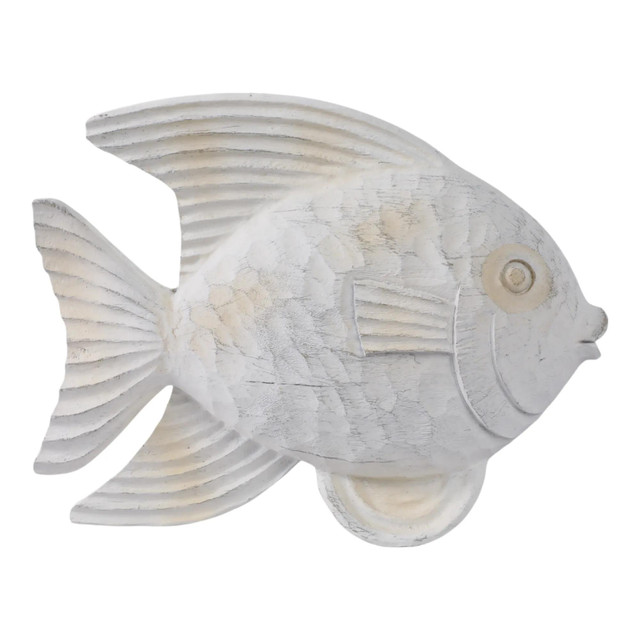 Bring seaside charm to your space with the Coastal Whitewash Fish Sculpture, perfect for the living room, bedroom, or office. This beautifully crafted piece features detailed fins, carved accents, and a dynamic 3D design for stunning display from any angle. Finished in a neutral whitewash with tan undertones, it evokes a breezy coastal feel that pairs effortlessly with coral, seashells, or sea glass decor. A perfect accent for nautical or beach-inspired interiors. Measures: 7.5 in x 10 in x 3 in