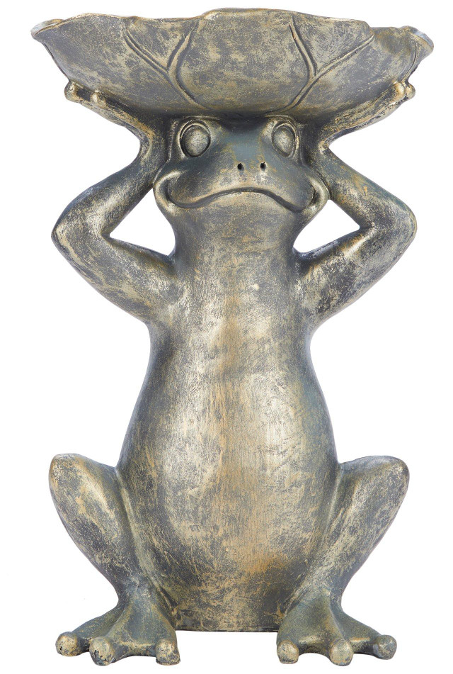 This charming frog garden accent stands 13 inches tall and holds a small bird bath in its hands. Crafted with whimsical detail, it adds a playful and inviting touch to any outdoor space. Ideal for gardens, patios, or porches. 9x13 in.