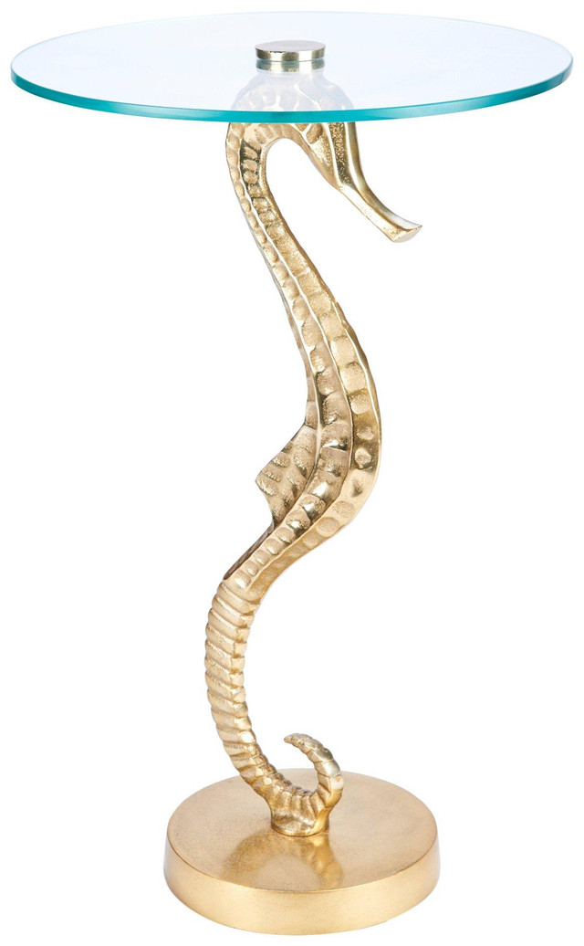 Introducing the 25 in Seahorse Side Table, a striking addition to your home decor. This unique table features a metal base shaped like a seahorse, adding a touch of elegance and whimsy to any room. The glass top provides a sleek and modern surface, perfect for displaying items or holding beverages. Measuring 25 inches, this side table combines artistic design with functionality, making it an eye-catching centerpiece for your living space.