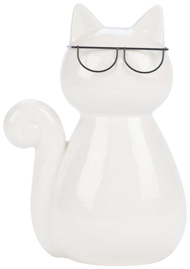 Add a touch of charm to your décor with this Ceramic Cat with Glasses Figurine. Crafted with sleek lines and a shiny finish, this elegant piece brings a modern, minimalist vibe to any space. Perfect for shelves, mantels, or tabletops, it's a stylish accent that makes a purr-fect conversation starter. Measures approximately 8.5 in x 6 in x 3.5 in.