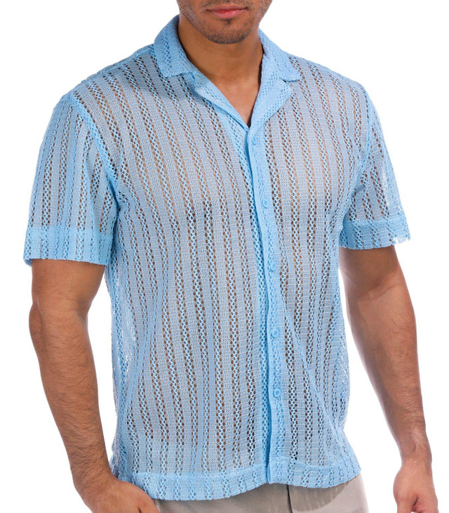 Elevate your summer style with this Men's Short Sleeve Crochet Button Down Shirt. Crafted from a soft polyester-spandex blend, it features a breathable crochet design, classic collar, and button-down front. Perfect for casual days or beach vibes, its solid color and relaxed fit offer effortless cool and comfort.