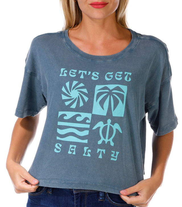 Juniors Stay Salty Graphic Crop Top brings laid back beach vibes with a soft washed finish and lightweight fabric. Featuring a crew neckline, short sleeves, and a cropped fit, it is styled with a beach themed graphic and Stay Salty script for a relaxed coastal look. Fabrication 100% cotton