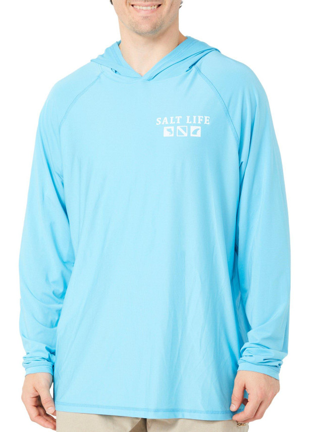 This men's long sleeve tee with hoodie features sun protection, quick dry performance, antimicrobial properties, and mega soft ultra light fabric. Designed for comfort and freshness in active or casual settings. Fabrication is 86% polyester and 14% spandex.