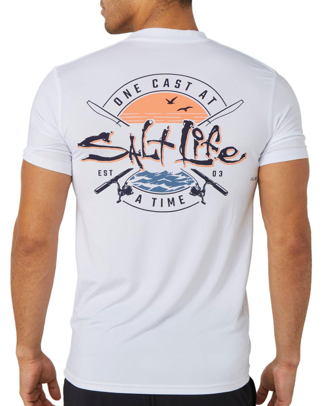Gear up for action with our Men's One Cast At A Time Performance Shirt. Featuring a bold brand graphic on the back, this short-sleeve tee offers UPF 50+ protection, moisture-wicking, quick-dry fabric, and performance stretch. Fabrication 86% polyester, 14% spandex