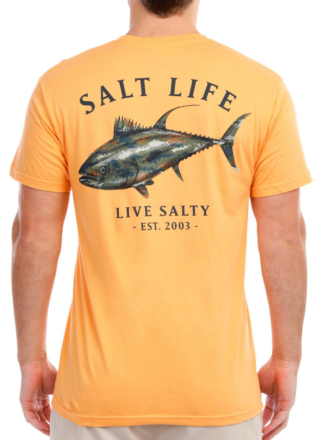 Gear up for your next weekend getaway or beach vacation with our Mens Tuna Journey Pocket T-shirt. Made from a soft blend of 100% preshrunk cotton, this t-shirt features a chest slip pocket and logo script on the front, crew neckline, short sleeves and tuna graphic design on the back