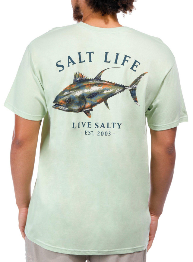 Gear up for your next weekend getaway or beach vacation with our Mens Tuna Journey Pocket T-shirt. Made from a soft blend of 100% preshrunk cotton, this t-shirt features a chest slip pocket and logo script on the front, crew neckline, short sleeves and tuna graphic design on the back