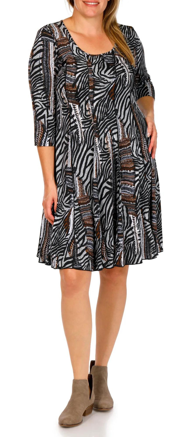 This Plus 3/4 Sleeve Panel Dress showcases a bold print, a flattering scoop neckline, and 3/4 sleeves for easy wear. Its relaxed silhouette and eye-catching design make it a standout choice for everyday style or casual outings. Fabrication is 94% polyester, 6% spandex