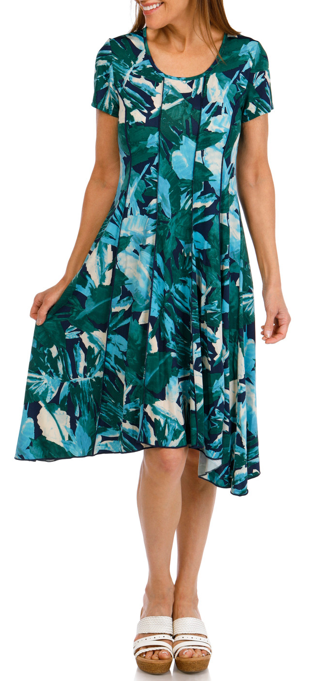 Bring fresh elegance to your wardrobe with this womens short sleeve botanical print panel dress featuring a round neckline and a flattering midi length. Soft and easy to wear, it offers a timeless silhouette that transitions effortlessly from daytime outings to evening plans. Fabrication is 94% polyester, 6% spandex.