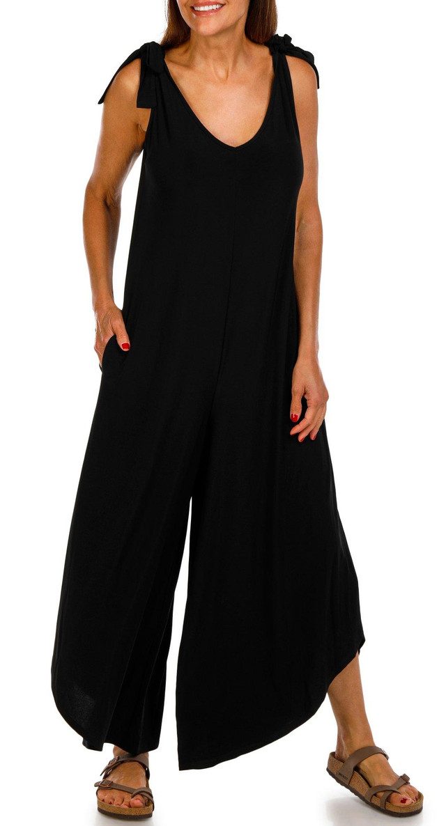Stay cool and stylish in a sleeveless jumpsuit designed with a flattering V-neckline, adjustable shoulder ties, and convenient side slip pockets. The solid color and relaxed fit create an effortlessly chic look, ideal for warm-weather days, casual gatherings, or weekend getaways. Made for all-day comfort with a modern, laid-back edge. Fabrication 94% polyester, 6% spandex.