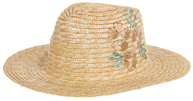 Looking for a touch of detail? This charming fedora features palm leaves embroidered on the side for a clean accent on a classic hat. Made with a 3 brim and 100% wheat straw, you wont want to miss it!