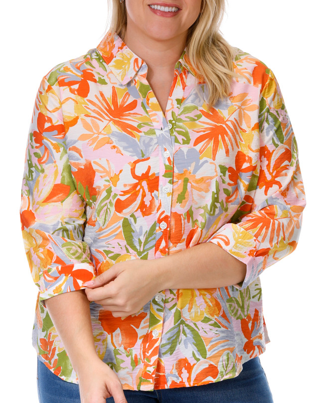 Add effortless charm to your wardrobe with this plus size 3/4 sleeve floral button down top. Featuring a vibrant floral print and a classic button front, it offers a flattering, easy-to-wear silhouette. The 3/4 sleeves provide comfortable coverage, making it perfect for everyday wear or casual outings. Top length measures approximately 25 inches. Fabrication 80% rayon, 20% nylon