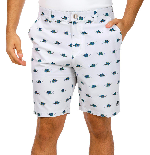 The Men's Fly Sail Walk Shorts bring island vibes to everyday wear with a relaxed graphic print, button-fly zip closure, side and back pockets, and a unique hybrid texture. Designed for comfort and style, these shorts feature a 9 inch inseam perfect for warm weather adventures or casual outings. Fabrication 92% polyester and 8% spandex.