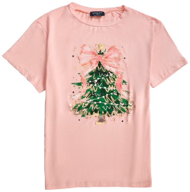 This petite short sleeve Christmas top features a festive Christmas tree with gold accents and a large pink bow on a soft pink background. With a comfortable crew neck, it brings cheerful holiday charm to seasonal outfits and everyday moments. Fabrication is 95% rayon and 5% spandex. Length measures approximately 24 in.