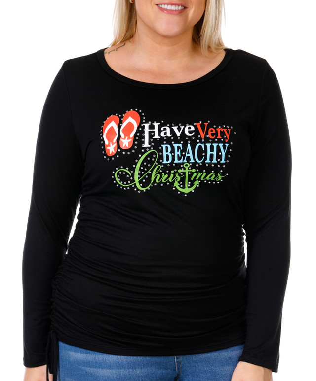 Celebrate the season in style with this Plus Beachy Christmas Long Sleeve Rushed Knit Top, a black round neck long sleeve knit featuring ruched sides with ties and embellished rhinestone text Have a Very Beachy Christmas across the chest. Perfect for holiday gatherings and cozy winter days. Fabrication is 95% rayon, 5% spandex. Length measures approximately 29 in.