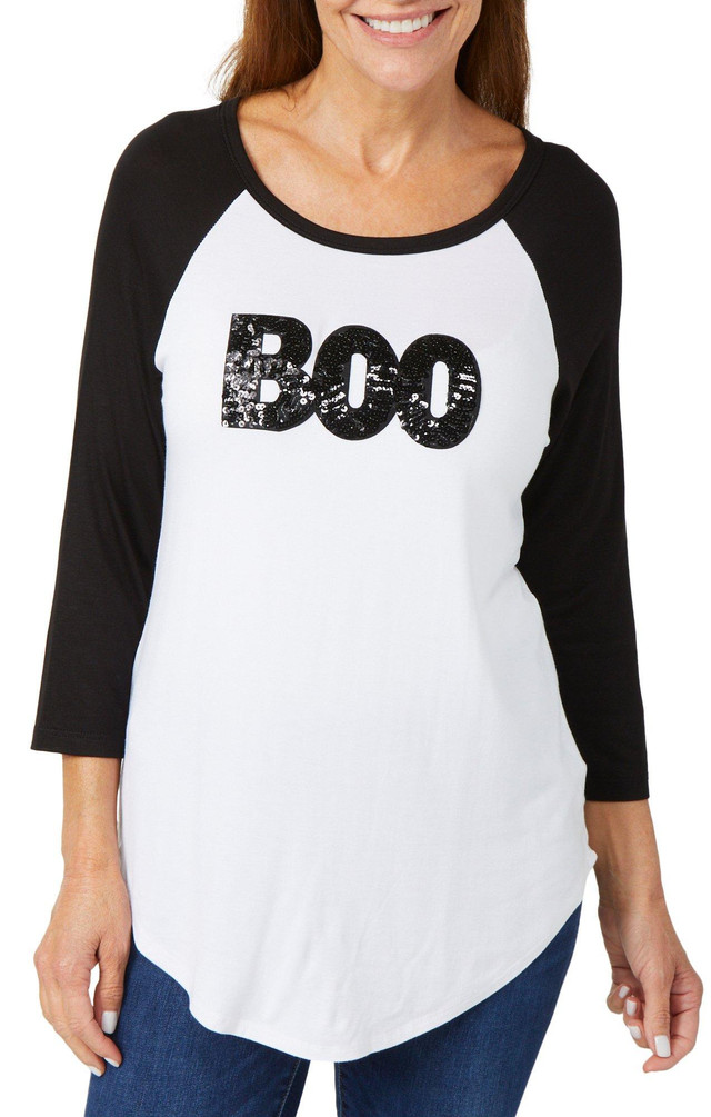 This womans soft 3/4 sleeve tee features a playful sequin patch that spells out boo. Perfect for seasonal style with a touch of sparkle and comfort. Fabrication is 95% rayon and 5% spandex.