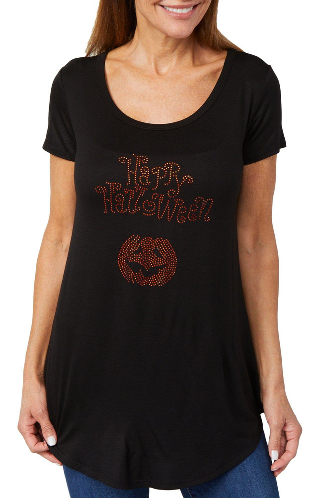 This womens soft short sleeve tee features a Happy Halloween script and a jack o lantern graphic with embellishments. Perfect for festive style with a playful touch and comfortable fit. Fabrication is 95% rayon and 5% spandex.