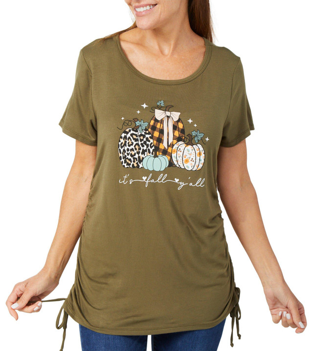 This womens short sleeve soft top features a harvest pumpkin graphic and side ruching with ties for a flattering fit. Comfortable and festive, it adds seasonal charm to casual style. Fabrication is 95% rayon and 5% spandex.
