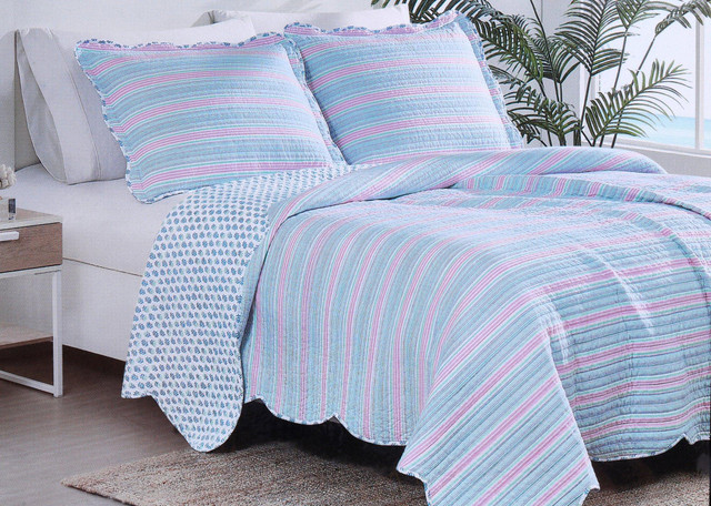Introducing this beautiful 3 piece Catalina Quilt Set, made from a blend of cotton and polyester for ultimate comfort and durability. This versatile set features a reversible quilt, offering two stylish looks in one: one side with a charming design and the other with a complementary pattern. Included are two matching pillow shams that complete the ensemble. Perfect for adding a touch of elegance and coziness to your bedroom, this quilt set combines style and functionality.