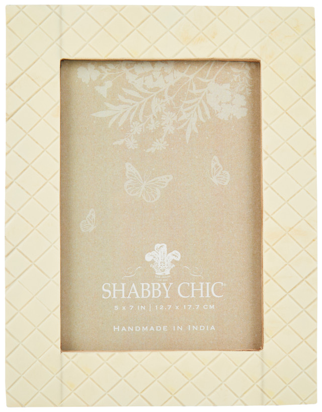 This elegant photo frame features a soft beige finish with a diamond-patterned texture for added depth and charm. Sized for a 5x7 photo, its a beautiful way to showcase memories with a touch of shabby chic style. Whole frame measures 7 in x 9 in.